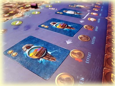 Beispielsweise hatte ich in meiner letzten Partie festgestellt, dass ein Mitspieler bereits mit 3 Gebäuden beim Steinmetz vertreten war. Er hatte also vor, eine Menge Punkte über die Stadtmauer zu generieren. Meine Überlegung war, ob es überhaupt sinnvoll ist, hier auch noch aktiv zu werden, da jedes zusätzliche Gebäude beim Steinmetz auch die drei vorhandenen Gebäude des erwähnten Mitspielers aktiviert, was ihm zusätzliche Gelegenheiten bietet, sein Mauerprojekt noch weiter voranzutreiben. Dieses Prinzip lässt sich natürlich übertragen auf andere Aktionsfelder wie den Markt, der den Erwerb von Schiffskarten erlaubt. Es durchdringt und prägt den Spielverlauf, sobald die Spieler in der Stadt aktiv werden.