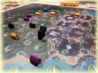 Das Spielfeld glänzt nicht unbedingt durch Übersichtlichkeit. Die schwach erkennbaren Hexfeldlinien sorgten in allen meinen Spielrunden für Stirnrunzeln.