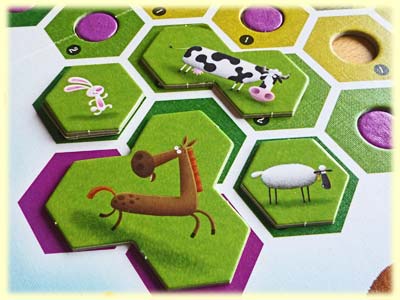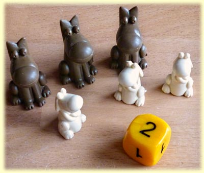 Umso größer wird aber auch die Gefahr, dass Tiere von Fuchs oder Wolf verschlungen werden. Denn wenn einer dieser Gesellen gewürfelt wird, überprüft man mit dem Zahlenwürfel, wie weit der hungrige Räuber sich aus dem Wald herauswagt. Da die Weideländer rund um die Bauernhöfe nur auf einer Würfelseite vertreten sind, sind die Tiere dort wesentlich sicherer als in Waldesnähe, denn diese Felder sind auf dem Würfel gleich dreimal vorhanden. Tiere auf dem Bauernhof sind übrigens immer geschützt, und der Fuchs frisst nur Kaninchen, während sich der Wolf mit derlei "Kleinkram" gar nicht erst abgibt und nur die großen Tiere erlegt.
