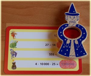 So weit, so gut. Aber bereits bei den Aufgabenkarten fangen die Probleme an: Sie sind wunderbar in vier Schwierigkeitsstufen gegliedert, so dass durchaus Kinder unterschiedlichen Alters miteinander spielen können, ohne dass einer Vorteile hätte, weil er im Rechnen schon weiter ist als ein Mitspieler. Die Lösung der Aufgabenkarten ist immer mit einer roten Markierung belegt und soll laut Spielregel nur mit Hilfe des Magiers Mathiculus (er verfügt über einen Rotfilter) gelesen werden können. Tatsächlich aber war es so, dass alle Kinder meiner Testrunden die Lösungen problemlos auch ohne diesen Filter erkennen konnten, selbst wenn die Karten in einiger Entfernung lagen. Ein nett gemachtes Extra des Spieles wird auf diese Weise sehr schnell zum unnützen Zusatzteil degradiert.