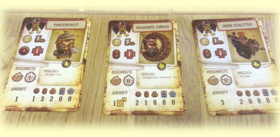 Für uns Deutsche mutet es im ersten Augenblick merkwürig an, dass da ein "Bismark-Reich" gegen Alliierte kämpft ... und die Generäle z. B. "Romler" und "Baron Gustav Tanken" heißen. Das liegt natürlich daran, dass es für Amerikaner sehr exotisch klingende Namen sind, die gleich einen leichten Kriegshauch verbreiten, jedoch bei uns eher ein leichtes bis irritiertes Schmunzeln auslösen. Aber eben manchmal auch mehr als das: Es gab Spieler, die konnten sich mit der Idee, den Ersten Weltkrieg in Steampunk-Atmosphäre zu spielen, überhaupt nicht anfreunden. Manche fanden es sogar ein wenig geschmacklos.