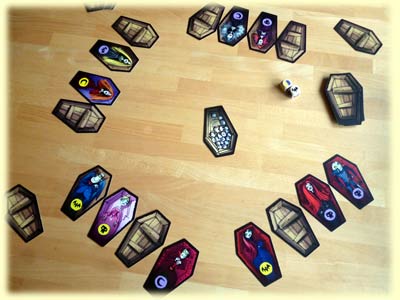 Das Spiel endet, sobald ein Spieler vier Särge zur Seite schubsen konnte.
