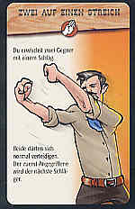 Bei den Schlägerkarten hat man jedoch einen Faux pas begangen. Ein Markieren der aktuellen K.O.-Punkte ist aufgrund der winzigen Skala kaum möglich. Da sucht man sich besser einige Chips aus anderen Spielen und verteilt diese an die Mitspieler.