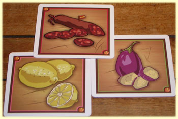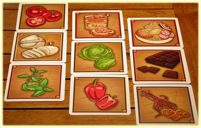 Das Spielmaterial besteht aus 56 unterschiedlichen Karten, welche die kleine, robuste Schachtel nahezu perfekt ausfüllen. Eine solch handliche Verpackung ist äußerst praktisch für ein Partyspiel dieser Art, da man es so bequem und unproblematisch überall mit hinnehmen kann. Etwas größer wäre allerdings auch nicht schlecht gewesen, denn dann hätten vielleicht noch Punktechips mit hineingepasst. So benötigt man immer noch einen Stift und Zettel. Auch die Grafik ist sehr gelungen. Da es sich bei einigen Zutaten um regionale Spezialitäten handelt, wäre eventuell eine Benennung auf jeder Karte nett gewesen. Dafür ist das Material in der vorliegenden Form vollkommen sprachunabhängig, was auch seine Vorteile hat.