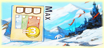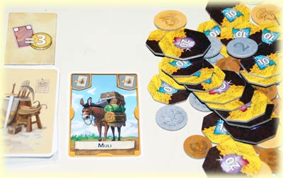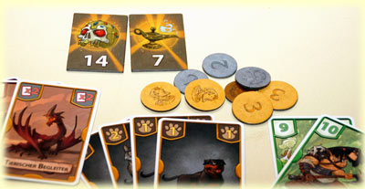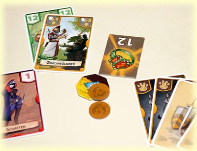 Danach musst du dich noch mit den Goblins auseinandersetzen. Nur mit ausreichend vielen Wachhunden kannst du dich gegen die räuberischen Banden schützen. Jeder Goblin, den du nicht abwehren kannst, klaut dir den angegebenen Münzwert. Führst du hingegen die meisten Wachhunde mit, kannst du dir jedoch sowohl alle abgewehrten Goblins als Trophäe sowie deren Beute aneignen. Schließlich legst du noch deine Münzkarten vor dir ab und nimmst dir entsprechend Kupfer-, Silber- und Goldmünzen aus dem Vorrat.