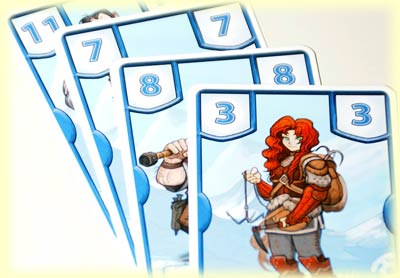Diese Karten spielst du anschließend in der 2. Phase aus. Zuerst werden die drei Orte nacheinander ausgewertet. Dazu legst du zunächst alle deine Abenteurer für die Frostberge offen ab. Hast du das stärkste Team, hast du Anspruch auf den schwer zu findenden Schatz. Das schwächste Team, das sich dorthin gewagt hat, erhält den leicht zu findenden Schatz. Dasselbe Prozedere wird dann auch für die Schätze in den beiden anderen Orten durchgeführt.