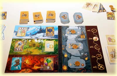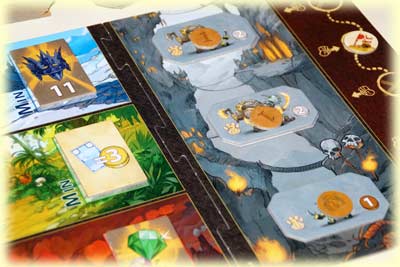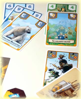 Die Phase "Karten ausspielen" birgt dennoch so manche Überraschung, vor allem in den drei Orten. Lediglich die Abenteurer der entsprechenden Orte müssen nämlich sofort ausgelegt werden. Das Ergebnis kann danach aber noch durch Aktionskarten beeinflusst werden. So kann der Wert nachträglich noch erhöht (etwa durch ein "Flammenschwert" oder den passenden tierischen Begleiter) oder reduziert (z.B. durch einen "Schlaftrunk") werden.