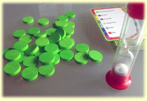Das Spielmaterial ist für ein Wortspiel dieser Art voll funktional: 110 doppelseitig bedruckte Karten mit je 6 Begriffen sowie 40 hölzerne Punktechips und eine Sanduhr. Für die Fallensteller werden Papier und Stifte zusätzlich benötigt.