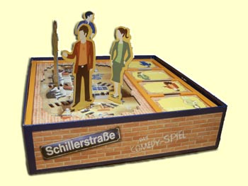 In der Schachtel ist die Bühne der Schillerstraße zu sehen. Dort gibt es fünf Orte (Eingang, Fenster, Klo, Sofa und Küche), an denen sich etwas abspielen wird. Vier Figuren, zwei Männer und zwei Frauen, starten am Eingang. Für jede Figur gibt es einen Stapel mit Karten, die gemischt bereit liegen.