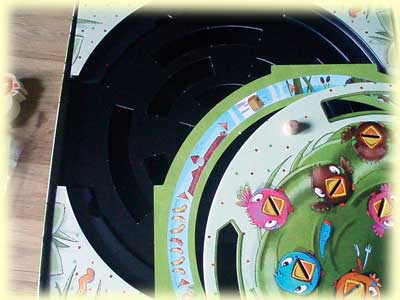 Dann darf man ein Küken in der Farbe des Elterntiers füttern. Dazu nimmt der große Vogel einen Wurm in den Schnabel und versucht ihn dann in einen Kükenschnabel zu stecken. Klappt das, indem der Wurm verschluckt wird, darf dem Küken der Schnabel mit einem Plättchen geschlossen werden. Lässt sich der Wurm nicht versenken, ist der Wurm verloren und das Küken noch immer hungrig. Weiter geht es und der nächste Spieler darf einen Fütterungsversuch starten.