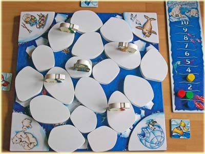 Zwar kam die oben beschriebene Extremsituation nur einmal vor, aber trotzdem wirkt die Regel, dass man nur Schollen betreten darf, welche die eigene tatsächlich berühren, sehr Spielfluss hemmend. Denn oft würde man gerne in andere Richtungen ziehen, weil man genau weiß, dass sich dort noch unentdeckte Schollen und daher mögliche Siegpunkte befinden, aber die Konstellation der Schollen lässt eine Bewegung in diese Richtung einfach nicht zu. In unseren letzten Testpartien haben wir diese Berührungsregel versuchsweise ein wenig gelockert. Benachbarte Schollen durften auch dann betreten werden, wenn der Abstand zwischen ihnen nicht breiter war als die Breite des Eisbären. Die Probe, ob der Spalt auch nicht breiter war, ließ sich für alle Spieler ganz leicht ausführen. Richtig große Lücken dagegen waren nach wie vor tabu. Und dass schmälere Spalten von Eisbären (und auch dem Eskimo) übersprungen werden können, erschien den Kindern glaubwürdig.