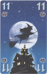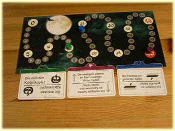 Die Aufgabenkarten: Bevor es los geht, werden drei Aufgabenkarten an den Spielplan gelegt. Die Spieler versuchen im Spielverlauf, ihre Auslage so zu gestalten, dass sie zum Zeitpunkt der Wertung die Aufgaben möglichst gut erfüllen. Eine Aufgabe kann sein, die höchste Summe an Kartenwerten zu haben, die meisten Karten mit ungeraden Werten, die niedrigste Kartenwertsumme einer bestimmten Farbe, die meisten Kürbisköpfe auf den Karten, die höchste abgedeckte Karte, die niedrigste Abdeckkarte, ...
