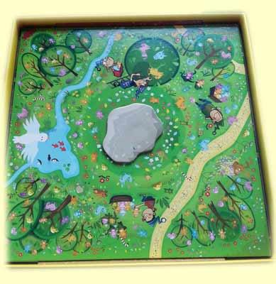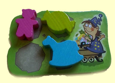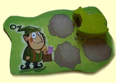 Nachdem jeder ein kleines Spielertableau erhalten hat, kommt die Schachtel in die Mitte und die Abdeckung darauf. In der ist ein kleines Loch und durch das wird zufällig ein Spielzeug aus dem Beutel in die Koboldhöhle (Spielschachtel) gesteckt und mit einem "Stein" abgedeckt. Alle müssen sich gut merken, welche Form und Farbe das Spielzeug hatte.
