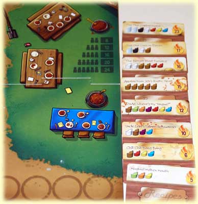 Die Verwertung der Schoten verlangt wiederum taktisch-planerisches Vorgehen, um auf die eine oder andere Weise möglichst viele Siegpunkte einzufahren. Dabei kommt es auch zu direktem Konkurrenzkampf. Vor allem die Rezepte im Cookoff, welche insgesamt die meisten Siegpunkte versprechen, sind heiß umstritten. Hier gilt es auch, die möglichen Aktionen der Mitspieler zu berücksichtigen. In diesem Zusammenhang finde ich die Verwendung von Sichtschirmen recht lobenswert, um allzu genaues Durchrechnen zu verhindern und dem Spiel eine ordentliche Prise Unsicherheit zu lassen.