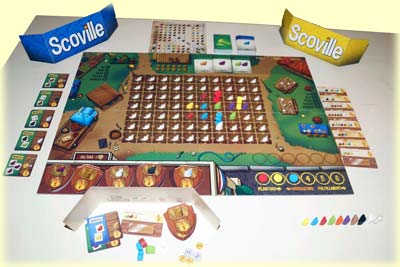 Das Städtchen Scoville besteht aus einem großen Chili-Feld in der Mitte des Spielplans, welches von verschiedenen Gebäuden oder Örtlichkeiten gesäumt wird. Einem Farmer's Market, an dem Chili-Schoten verkauft werden können. Einem Auktionshaus, an dem man Chili-Schoten ersteigern kann. Einem "Chili Cookoff", an dem die Farmer mit ihren geernteten Schoten die schärfsten Gerichte zubereiten können und einem Rathaus, in dem Auszeichnungen auf besonders scharfe Züchtungen warten.