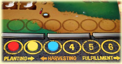 Jeder Spieler verfügt noch über drei verschiedene Bonusaktions-Plättchen, die ihm erlauben, eine zusätzliche Schote anzubauen, seine Farmer-Figur einen zusätzlichen Schritt zu bewegen oder die Figur einmal kehrt machen zu lassen. Der Einsatz dieser Plättchen will aber wohlüberlegt sein, bringt doch jedes nicht verwendete Plättchen vier wertvolle Siegpunkte. Eine knifflige Sache, die mir gut gefällt.