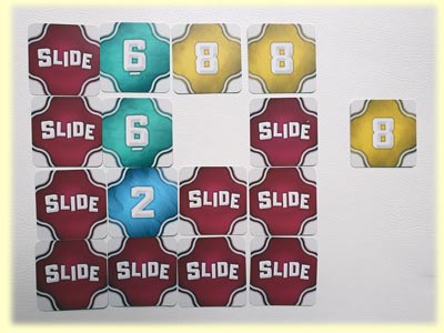 Die jeweils ausgewählte Karte muss von außen in eine Spalte oder Reihe eingeschoben werden, um so die Lücke zu füllen, die zuvor durch die Kartenentnahme entstand. Diagonales Verschieben geht nicht. Die Karte darf nicht selbst direkt in die Lücke geschoben werden, wenn die Lücke am Rand liegt. Somit wird eine Lücke immer indirekt gefüllt, da nie die gerade eingeschobene Karte die Lücke schließt.
