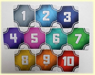 Aufbau: Mischt die 100 quadratischen Karten, die je 10-mal die Werte 1 bis 10 zeigen. Verteilt an jeden Spieler verdeckt 16 Karten, die im 4x4-Raster angeordnet werden. Bestimmt einen Startspieler, der den Slide-Marker erhält.