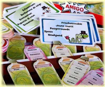 Im Original wird alles über Karten abgewickelt. Amigo hat sich einen Flaschenhalter für die Schlangenöle ausgedacht, die Begriffe werden in fünf Sprachen auf kleinen Flaschenkärtchen angeboten, von denen sechs immer im Flaschenhalter stecken, je nach Sichtfenster lässt sich Snake Oil damit auf Deutsch, Französisch, Holländisch, Italienisch und Englisch spielen. Das Öffnen dieser Fenster ist in der Spielvorbereitung aber recht mühselig und führt meist zu Einrissen in der Tafel. Mir hätten die Karten des Originals durchaus gereicht. Der Erfolg des Spiels hängt von der Begeisterungsfähigkeit der Runde ab, die sich auf Snake Oil einlässt. Obwohl jeder stets nur sechs Begriffe zur Verfügung hat, kommen die verrücktesten Wortschöpfungen zustande. Entscheidend sind letztlich die Verkaufsargumente, da gibt es natürlich starke und schwache Verkäufer, die bei objektiver Bewertung den anderen enteilen oder schnell hinterherhinken. Ein subjektiver Wertungsmechanismus, der die eigene Gewinnorientierung im Blick behält, konterkariert natürlich diesen Ansatz. Soll ich wirklich meinem schärfsten Konkurrenten die Rollenkarte zugestehen, auch wenn er noch so gut argumentiert hat?