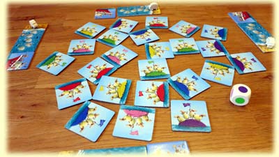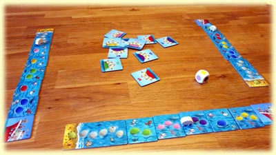 Reihum wird dann gewürfelt und jeweils ein Meeresplättchen in der gleichen Farbe wie der Würfel genommen, umgedreht und mit der Felsenseite, die ein bis drei farbige Felsen zeigt, links neben das Boot eingefügt, so dass eine immer längere Strecke zum Boot entsteht. Hat man das Glück und würfelt eine Farbe, in der man schon Felsen besitzt, darf man die Anzahl dieser Felsen mit seinem Schaf in Richtung Boot vorrücken.
