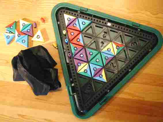 Durch geschicktes legen von farbigen Dreiecken auf das Spielfeld versuchen die Spieler im Team Punkte zu sammeln.