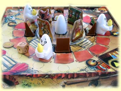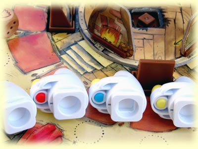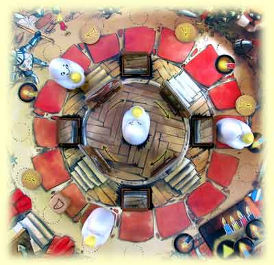 "Spieglein, Spieglein an der Wand, wer ist das Gespenst in diesem Land?" So könnten wir den bekannten Spruch aus dem Märchen Schneewittchen abwandeln, um das Spielziel zu erklären. Wir müssen dazu wissen, dass Gespenster kein Spielgelbild zeigen. Und von den vier lustigen Gespenstern ist nur eines das Echte. Äußerlich sehen alle vier gleich aus, sie unterscheiden sich nur durch die Farbe ihrer Kerze, und die ist zunächst nicht zu erkennen. Für Insider sei hier verraten, dass man vor dem Spiel jedem Gespenst eine der vier Kerzen ins Händchen schieben muss ohne nachzusehen, welches das Echte ist. Das erkennt man, wenn man ihm unter das Bettlaken guckt, aber dazu später mehr. Geheimnisvoll huschen diese vier also durch die alte Burg und lassen die Mitspieler erst einmal Kerzen-Chips sammeln. Vier Stück sollen es sein, in deren Licht das jeweilige Symbol des Spielers leuchtet. Würfelgesteuert laufen die Geister und man darf den Chip auf dem Zielfeld aufdecken, wenn es der richtige ist auch behalten. Nun gut, das ist nicht so innovativ und eher ein harmloses Geplänkel. Richtig spannend wird es, wenn auf dem Würfel das Gespenst-Symbol erscheint. (Chance 1:2) Dann darf die so genannte Gespenster-Probe durchgeführt werden. Und hierbei haben sich Autor und Verlag für Spiegel-Spukschloss richtig was einfallen lassen. Das Zentrum des Schlosses ist mit einem Drehmechanismus versehen, darum herum stehen vier Spiegel, die allerdings durch Gegenstände aus dem Schloss verdeckt sind.