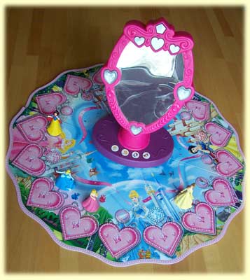 Auf dem Spielplan rund um den Spiegel werden die 16 herzförmigen (und natürlich rosa) Prinzessinnenkärtchen verdeckt ausgelegt. Wer an der Reihe ist, würfelt und zieht entsprechend weit in eine beliebige Richtung. Landet man auf einem Herzchenfeld, auf dem sich eine Karte mit der eigenen Prinzessin verbirgt, dann ist die kleine Prinzessin befugt, den magischen Spiegel per Knopfdruck zu aktivieren. Erscheint im Spiegel begleitet von einer märchenhaften Melodie der Prinz, darf die Karte behalten werden. Erklingt dagegen das boshafte Lachen der Stiefmutter, deren Konterfei man dann ebenfalls im Spiegel erblickt, muss die Herzkarte zurück an ihren Platz gelegt werden. Fremde Prinzessinnen muss man immer zurück auf den Spielplan legen.