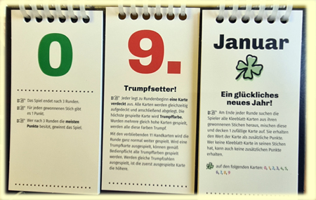 Werfen wir zuerst kurz einen Blick auf das Material. Zusätzlich zu den Grund- und diversen Extrakarten liegt dem Spiel ein Aufstellkalender bei. Über 3 Bereiche lassen sich die Einer- und Zehnerstelle sowie der Monat einstellen. Jedes dieser Blätter definiert entsprechend die Regeln. Es gibt somit Regelteile, die sich täglich ändern oder aber monatlich. Aber genau bekommt man in Summe 365 verschiedene Regelkombinationen zusammen. Der Kalender ist ein tolles Gimmik, lediglich der Unterbau, auf den der Kalender gestellt wird, zeigte zumindest bei unserem Exemplar eine Schwachstelle und musste nachgelegt werden.