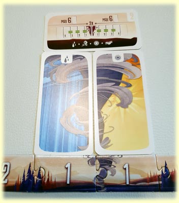 Wind: Nimm 1 Karte aus der Reihe, an die du gerade die Windkarte angelegt hast, und lege sie zwischen 2 Karten aus derselben Reihe, die weiter entfernt von der Windkarte liegen (oder ans Ende der Reihe). Stelle sicher, dass du tatsächlich die Situation veränderst. Anmerkung des Rezensenten: Diese Regel ist schwammig und ich würde sie in Bezug auf die Hilfskarte dazu so auslegen, dass man aus der Halbreihe mit der Wind-Karte 1 Karte nimmt und erst in der anderen Halbreihe einschiebt bzw. dort ans Ende setzt.