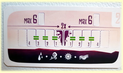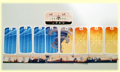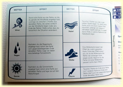 Der Nachziehstapel konnte Karten von 4 Wetter-Zuständen liefern. Unter Umständen zwingen aber 3 momentan ungünstige Handkarten (weil ggf. alle identisch sind und ihr Effekt gerade nicht hilfreich) zum Abwurf aller 3 Karten und dann Ausführung einer ersatzweise gezogenen Karte.