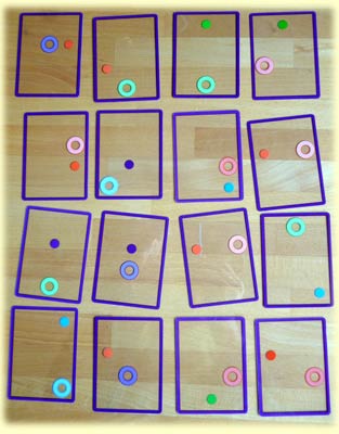 Das Spiel besteht aus 60 durchsichtigen Karten, auf welche an verschiedenen Stellen Punkte und Ringe in unterschiedlichen Farben aufgedruckt sind. Von diesen Karten werden vier mal vier offen ausgelegt. Danach spielen alle gleichzeitig, denn es gilt, passende Karten zu finden.