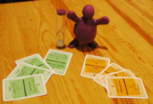 Auf jeder Karte stehen 2 Suchbegriffe: Ein einfacher Begriff, wofür man bei erfolgreichen Raten einen Punkt erhält, wenn man ihn errät und einen schwereren Begriff, der dem Rateteam zwei Punkte einbringen kann. Der Puppenspieler muss immer mit dem leichten begriff starten.