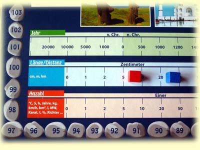 Da man diese zwei Zahlen schnell verinnerlicht hat, verläuft die Wertung meistens sehr flott. Auf der anderen Seite führt dies dazu, dass immer zuerst die geografischen Felder besetzt werden und das Spekulieren auf andere Werte sich erst lohnt, wenn man die relativ sicheren 3 oder 7 Punkte für geografisches Wissen eingestrichen hat. Denn hier haben viele der Mitspieler oft wenigstens eine Ahnung, wo sich das gesuchte Objekt befindet. Selbst wenn man keine Ahnung hat, kann man leicht punkten, indem man sich einfach neben den Stein eines Mitspielers setzt. Viel schwieriger wird es dagegen bei den Zahlenskalen, wobei es auch hier Unterschiede gibt. Während Fragen zu ägyptischen Bauwerken oder Berühmtheiten recht leicht einzuordnen sind, weil die Skala ein einziges Feld für die Zeit von 1000 v. Chr. bis zum Jahre 0 bereit hält, so geht es in der Zeit des 20. Jahrhunderts in 10er-Schritten vorwärts. Je neuer also etwas ist, desto schwieriger wird es. Auch bei den sonstigen Zahlenwerten wie Länge, Ausdehnung oder Mengenangaben fällt das Schätzen meistens schwer. Aber genau das macht auch den Reiz des Spiels aus, denn wie langweilig wäre die Sache doch, wenn man zu viel wüsste.