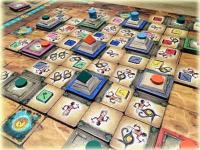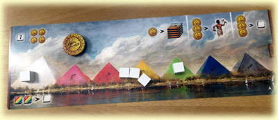 Sind genau 3 Arbeiter auf einem Baufeld, so kann man an (s)einer Pyramide werkeln. Dazu muss man aber auch Steine in der passenden Farbe abgeben und zwar immer genau so viele, wie es der Höhe der zu bauenden Pyramidenstufe entspricht. Mit der Farbe des für Ebene 1 abgegebenen Steines legt man fest, welche Farbe die Pyramide hat und welche Steine welcher Farbe somit für die höheren Stufen dieser Pyramide verwendet werden können. Leider, zu allem Unglück, gibt es bei den Arbeitern etwas Schwund und leichte Abnutzungserscheinungen, weswegen nach erfolgtem Bau nur einer der drei Arbeiter bei der Pyramide verbleibt. Möchte man also die Pyramide weiter bauen, so muss man nicht nur Steine besorgen, sondern auch wieder weitere Arbeiter heranführen, was sich im Spielverlauf aufgrund der immer mehr mit Plättchen belegten Spielfläche als immer schwerer erweist.