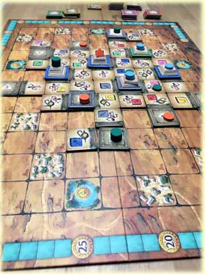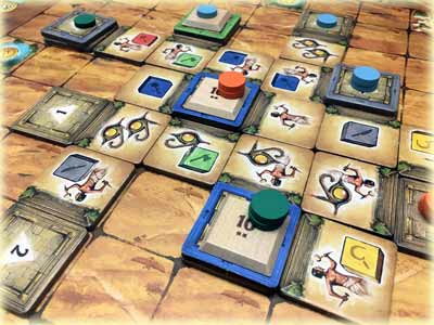 Etwas ratlos zurückgelassen hat uns die Regel, gelegte Bauplättchen so auszurichten, dass deren darauf abgebildete Stufen immer zum nächstgelegenen Bauplatz weisen. Außer der Ästhetik hat dies gar keinen Sinn. Hätte man die Stufen einfach weggelassen, dann hätte man dadurch auch gleich noch diese Regel einsparen können und zudem auf den Bauplättchen mehr Platz für die eigentlichen Symbole gehabt.