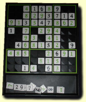 22.05.07 von Peter Nos - Hier bewerte ich nur die Solitärvariante. Das Material ist wirklich schön und praktisch, genauso stellt man sich ein Sudokubrett vor. Die Zweipersonenligrettovariante sollte man sich besser sparen (Spielbarkeit:3, Spielreiz:2 - immerhin ist es mal eine andere, wenn auch offensichtlich und nicht funktionierende Idee). |