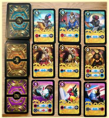 Das Spielmaterial von Time Division ist beeindruckend. In einem großen Karton kommt das Kartenspiel für 2 Personen daher. Darin enthalten natürlich die Spielkarten aber auch ein Spielbrett, 2 Podeste als Kartenerhöhung, 1 Siegpunktmarker und 1 Metallmünze. Die Illustrationen der Karten ist sehr künstlerisch. Alle Charaktere sind Tierfiguren, das muss man mögen. Passend dazu ist das Spielbrett gestaltet. Allerdings frage ich mich, brauche ich unbedingt ein toll gestyltes Spielbrett und Kartenpodeste für ein Kartenspiel, in dem ich maximal 3 mal 6 Karten aufspiele? Ich denke, da kann man geteilter Meinung sein. Ok, auf dem Spielbrett sind die verschiedenen Bereiche, wie z. B. "Vergangenheit", "Einflussbereich" oder "Temporäre Felder" eingezeichnet und mit Symbolen versehen. Diese Symbole finden sich auch bei den Effekten auf den Spielkarten wieder, so dass die Ausführung der Effekte vereinfacht werden soll. Aber muss es dann auch noch ein Extrafeld für die Münze geben? Auch die aufwändigen Kartenpodeste sollen es einsichtiger machen, dass man selbst bei den Effekten immer mit der Farbe "blau" gemeint ist und die gegnerische Zeitagentur immer "rot" ist. Nichtsdestotrotz ist die Symbolik der Effekte gewöhnungsbedürftig und vor allem zu Beginn sehr spielhemmend.