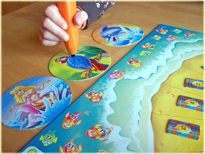 Wem das noch nicht schwierig genug ist, der kann zusätzlich zur Meerjungfrau noch den Piraten und/oder den Delfin auslegen. Dann wird nicht nur von der Meerjungfrau eine einzige Rechenaufgabe gestellt, sondern parallel dazu auch noch ein bis zwei zusätzliche Aufgaben. Man muss sich dann aber nicht nur die richtigen Ergebnisse merken, sondern auch noch, wer welche Rechenaufgabe gestellt hat, also welches Ergebnis zu wem gehört. In der dritten Schwierigkeitsstufe mit drei Aufgaben ist das sehr schwierig - ich habe dabei selbst des Öfteren einen Fehler gemacht. Als kleine "Aufwandsentschädigung" erhält man in solchen Runden aber eine Zusatzbelohnung, wenn man die Aufgabe einer Figur erfüllt, die schon länger nicht mehr bedient worden ist.