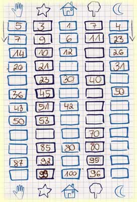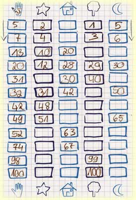 Auf ihren Zahlenblättern tragen die Spieler in jede Spalte an beliebigen Stellen jeweils eine der Startzahlen 10, 20, 30, 40 und 50 ein. Wer an der Reihe ist, nennt eine Zahl zwischen 1 und 100 und würfelt danach. Das Würfelergebnis gibt vor, in welche Spalte die genannte Zahl eingetragen werden muss, nur bei einem Joker hat man diesbezüglich freie Auswahl. Das Ergebnis gilt übrigens immer für alle Spieler. Innerhalb einer Spalte müssen die Zahlen aufsteigend notiert werden, wie groß die Lücken sind, die zwischen den einzelnen Zahlen frei bleiben, liegt in der Entscheidung der Spieler. Wer keine passende Stelle in der Spalte frei hat, kann auch nichts eintragen.