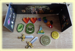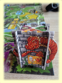 Die Zugweite der Spielfigur beträgt übrigens 0 bis 3 Felder. Es ist aber auch möglich, weiter zu laufen, wenn man pro zusätzlichem Feld eine Münze abgibt. Also sind nicht nur Schwerter wichtig, sondern auch Münzen. Aber auch die Edelsteine benötigt man, um sie entweder beim Händler gegen Münzen bzw. beim Goldschmied gegen Herzen zu tauschen oder um im Kampf den Drachen zu besiegen, was ebenfalls Herzen bringt.