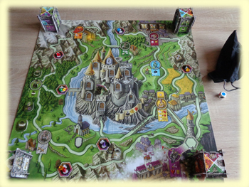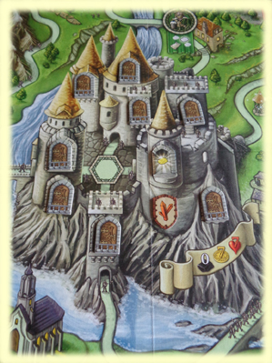 Der märchenhaft anmutende Spielplan zeigt zentral die Burg mit den verschlossenen Fenstern - hinter einem davon verbergen sich der Prinz und die Prinzessin. Im Schlosshof startet die Heldengruppe - und mit Gruppe ist in diesem Fall genau eine Spielfigur gemeint, die von allen zusammen genutzt wird. Was gleichsam bedeutet, dass ein Spieler mit der Figur von da aus weiterziehen muss, wo der Vorgänger seinen Zug beendete. Um die Burg herum liegen alle Aktionsfelder, auf denen man Schwerter, Herzen, magische Gegenstände und Geld erwerben und hinter seinem Sichtschirm lagern kann. Dazwischen findet man die Edelsteinminen - auf diesen Feldern darf man zwar seinen Zug nicht beenden, kann aber im Vorbeigehen einen Edelstein mitnehmen. Oder sogar zwei, falls ein schwarzer dabei liegt, den man nehmen muss, aber eigentlich gar nicht haben möchte. Denn er verhindert, dass man am Ende um die königliche Hand werben darf. Deshalb muss man ihn erst einmal bei der Brunnenfee (einem der Aktionsfelder) abliefern, was natürlich Zeit kostet.