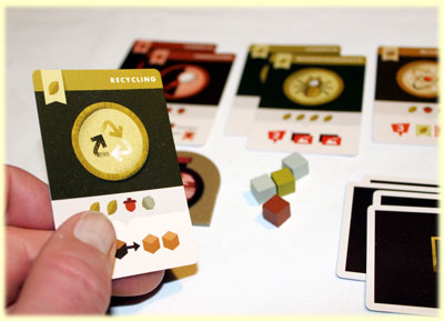 Die Spieler wandeln die Rohstoffe also in Wanderabzeichen um. Diese bringen dann nicht nur die darauf angegebenen Siegpunkte, sondern können auch einen einmaligen Effekt haben, also zusätzliche Rohstoffe, eine Ermäßigung, Gratis-Fotos, etc. Diese Soforteffekte sind eine recht gute Alternative zur Ausrüstung, die uns in Parks - wir erinnern uns - dauerhafte Vorteile verschafften.