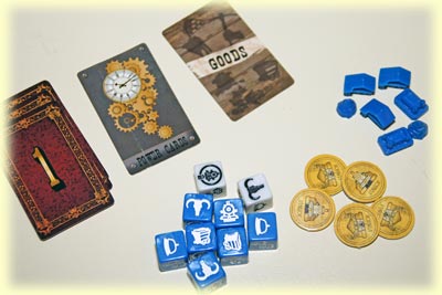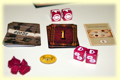 Noch ein paar Bemerkungen zum Spielmaterial. Alles ist hier relativ winzig ausgefallen: Der Spielplan wie erwähnt in kleinem Format, die Gebäudefiguren fizzelig, die Karten auch unpraktisch klein. Auch bei der Qualität gibt es Abstriche, so hätten die Karten stabiler ausfallen müssen, einige weisen in meinem Exemplar sogar Knicke auf. Wenigstens sind die Symbole auf den Würfeln klar erkennbar. Trains and Stations kann man daher im doppelten Sinne des Wortes nicht als "großes" Spiel bezeichnen ...