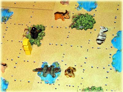 Sieht man von diesem im wahrsten Sinn des Wortes Kleinstmangel einmal ab, ist man dank einer übersichtlichen und umfassenden Regel schnell im Spielgeschehen. Diese ist derzeit leider nur in englischer Sprache verfügbar, eine Kurzspielregel wird hier bei H@ll9000 auf deutsch zur Verfügung gestellt. Die Bewegung der Tiere ist grundsätzlich ebenso schnell realisiert wie umgesetzt, lediglich die Startaufstellung bereitet bei den ersten Gehversuchen Schwierigkeiten. Es werden z. B. unter Umständen Tiere auf Felder platziert, welche für sie normalerweise Hindernisse darstellen. Nach dem Platzieren wird deren Stelle aber korrigiert und wenn man die Anordnung ein paar Mal geübt hat, geht's auch ganz zügig. Gleiches gilt für die Abbiegeregeln der Tiere im Falle einer Bewegung auf ein oder mehrere Hindernisse zu.