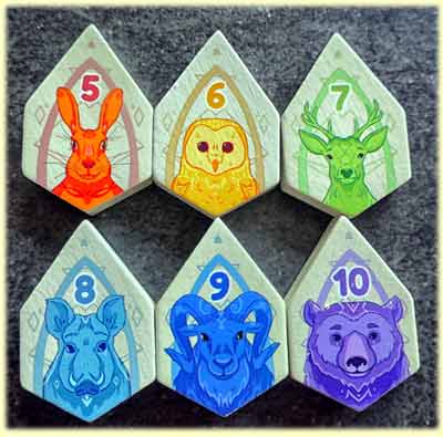 Am Spielende werden deine Steine gewertet. Ist es dir gelungen, eine Triqueta zu bilden, erhältst den aufgedruckten Wert an Punkten. Für Hasen gibt es 5, für Eulen 6, für Hirsche 7, für Wildschweine 8, für Widder 9 und für Bären 10 Punkte. Ein einzelner Stein zählt 1 Punkt, eine Zweiergruppe 2 Punkte. Hast du aber mehr als drei Steine einer Gruppe ist die Triqueta wertlos und du erhälst pro überzähligem Stein 1 Minuspunkt. Hinzu gezählt werden dann noch die Siegpunkte durch eventuell vorhandene Baumplättchen und Startmarker.