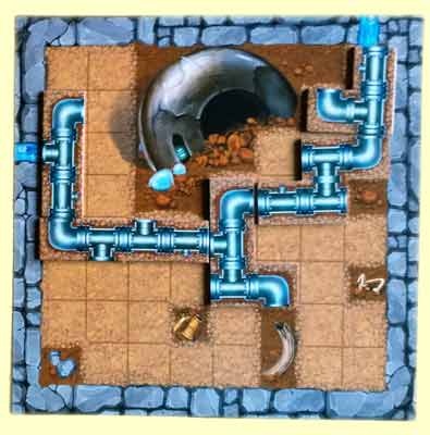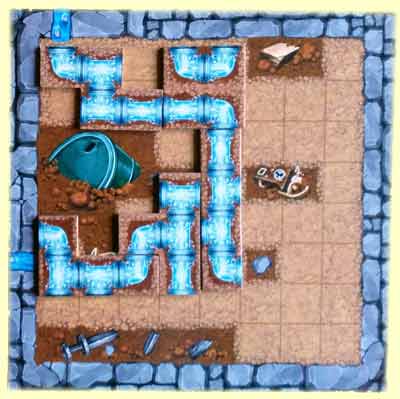 Zu Beginn erhält jeder Spieler einen Legeplan und ein 7-teiliges Leitungsset sowie einen Zählstein für die Wertungsleiste. Auf Kommando versuchen alle gleichzeitig, den Start- und Endpunkt auf dem eigenen Plan mit einer durchgehenden Wasserleitung zu verbinden. Die Leitung muss aus mindestens fünf Teilen bestehen, und Hindernisse auf dem Plan (= dunkle Stellen) dürfen nicht überbaut werden. Die Leitung darf Sackgassen, Abzweigungen und offene Enden aufweisen.