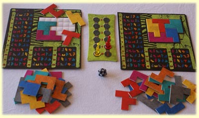 Orthogonal dazu ragt in die zweite Dimension das Ubongo Bring-Mich-Mit-Spiel. Hier sind Rätsel mit zwei oder drei Legeteilen zu lösen, und die Aufgabentafeln stellen zugleich die Siegpunkte dar. Besonders geeignet für die jüngeren Ubongo-Spieler.