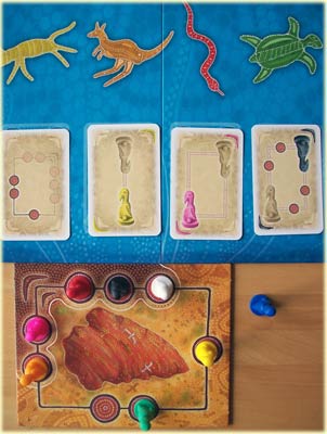 Weil man bei Uluru durch Üben immer besser wird, haben Fortgeschrittene gegenüber Anfängern einen klaren Vorteil. Diesen hat der Autor ein wenig auszugleichen versucht, indem er sich zum einen unterschiedliche Schwierigkeitsstufen in den Aufgabenkarten ausgedacht hat und zum anderen eine Spielplanrückseite mit Plätzen für zwei Kartenreihen. Auf diese Weise kann eine leichte Aufgabenreihe für die Anfänger (oder für Kinder) und eine schwierigere für Fortgeschrittene ausgelegt werden, so dass die Siegeschancen wieder ausgeglichener sind. Und weil die Kartenrückseiten deutlich mit dem Schwierigkeitsgrad gekennzeichnet sind, geht das Sortieren der Karten auch schnell vonstatten. Diese Spielplanrückseite ermöglicht es übrigens auch jenen Spielern, denen das Spiel irgendwann zu einfach wird, zwei Bedingungskarten pro Tier auszulegen. Aber das habe ich noch nie ausprobiert, denn in meinen bisherigen Testpartien reichte die Grundversion mit allen Karten voll und ganz.
