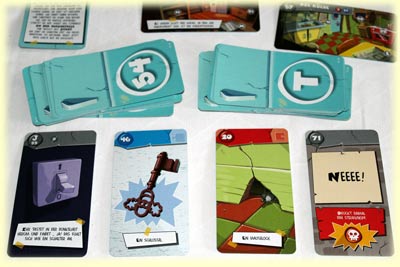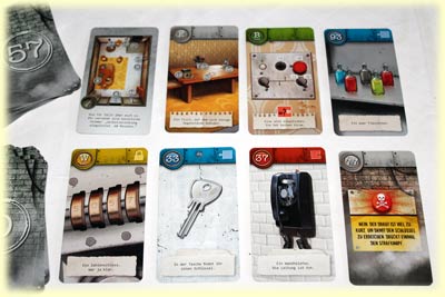 Die Startkarte erzählt die Hintergrundgeschichte und wird danach umgedreht, wo sie den ersten Raum des Abenteuers zeigt. Alle anderen Karten werden gemischt und als Stapel beiseite gelegt, sodass man ihre Rückseiten erkennen kann, die entweder Zahlen oder Buchstaben tragen. Tauchen in Räumen Zahlen und Buchstaben auf, suchen wir die entsprechenden Karten aus dem Kartenstapel und decken sie auf. So finden wir Objekte und Maschinen, die uns im Laufe des Spiels von Nutzen sein können.