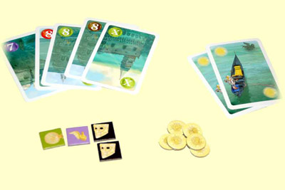 Auch auf den Prophezeiungskarten finden wir dieselben Farben und Werte, mit einer Ausnahme: Es gibt keine 2er-Karten. Von diesen 42 gut gemischten Karten wird der Großteil zufällig und verdeckt unter den Spielern verteilt, der Rest kommt unbesehen aus dem Spiel. Die quadratischen Schatzplättchen werden, nach Farben sortiert, neben dem Spielbrett bereit gelegt. Zum Abschluss der Vorbereitungsarbeiten erhält jeder ein von der Spielerzahl abhängiges Startkapital an Münzen, zwei Gondelkarten in seiner Farbe sowie ein paar Spielfiguren, welche von den Spielern reihum - eine nach der anderen - auf beliebige Felder des Spielplans platziert werden.